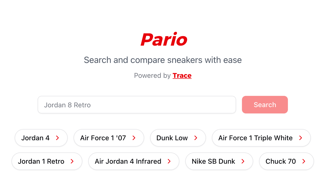 Currently in beta phase, we're actively seeking feedback as we continue developing the platform and working on deeper integration with Trace. Whether you're a sneaker enthusiast, reseller, or just looking for the best deal, Pario helps you make informed purchasing decisions by aggregating pricing data from multiple sources.